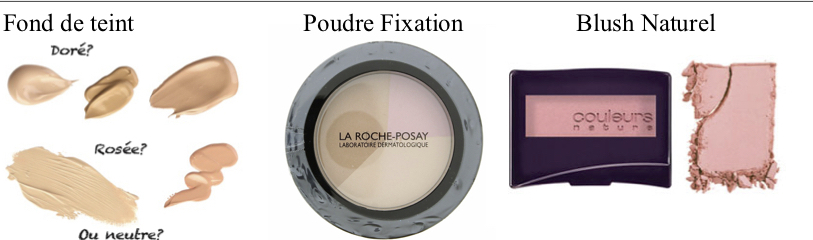 - Trousse à maquillage: Fards à paupière roses et marrons, Eye-liner, Mascara, Gloss transparent ou rosé (+ Fond de teint, Poudre de fixation, Blush naturel => Facultatif)