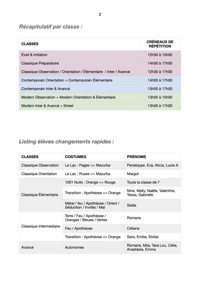 - Les Éveils / Initiations / Classique Préparatoire devront revenir habillés en tenue de cours, coiffés, maquillés et en ayant dîné.