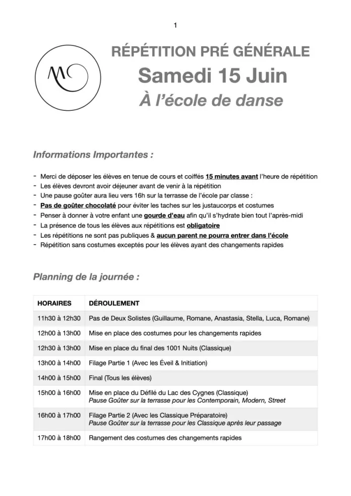 - Tous les élèves (exceptés les Éveils / Initiations / Classique Préparatoire) restent sur place toute la journée. Pensez donc à apporter toutes les affaires et costumes nécessaires.