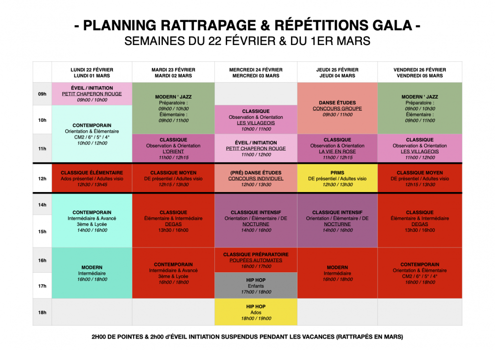 Car l’ensemble des cours a été rattrapé les mercredis de janvier et février. Cependant, les cours sont maintenus pendant les vacances scolaires aux horaires habituels pour que toux ceux n’ayant pas pu participer aux cours des mercredis ne soient pas pénalisés, et également afin d’anticiper de prochaines restrictions et prendre de l’avance ! -