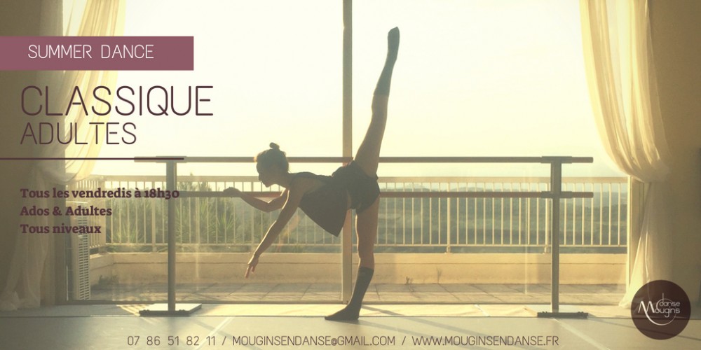 Pour toutes celles et ceux qui souhaitaient poursuivre leur cours de danse cet été, votre école est restée ouverte pour vous proposer un cours de danse classique tous les vendredis soirs! C'est LE RDV de Mougins en Danse de cette saison estivale: À 18h30, une dizaine de danseuses acharnées se retrouvent autour de la barre pour maintenir la forme et se préparer pour la rentrée septembre... Débutants, Moyens, Avancés... Toutes ensemble pour avancer! Alors ne perdez plus de temps et rejoignez-nous!