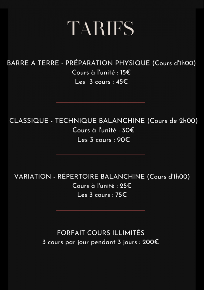 Les Master Class sont destinées aux danseurs confirmés (niveau avancés et professionnels) et auront lieu les 29/30/31 août de 09h00 à 13h00 dans notre belle école !