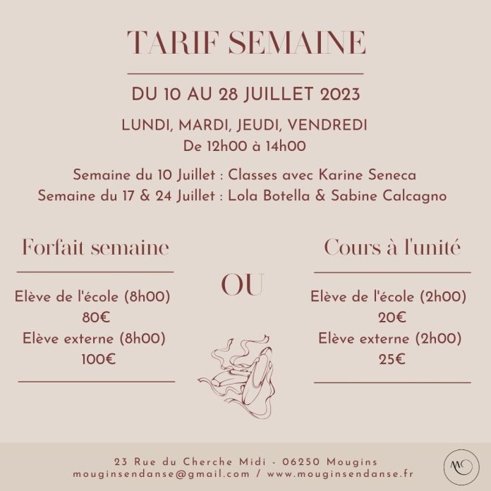 - Envoyez un chèque à l'ordre de Mougins en Danse (Josiane BESSY - 1 Rond Point Minangoy - 06250 MOUGINS) ou règlez directement sur place en espèces lors de votre premier Master Class