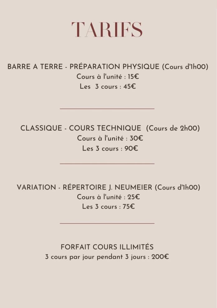 Chaque journée sera découpée en trois temps forts : Un conditionnement physique avec Sabine CALCAGNO, membre de l'équipe pédagogique Mougins en Danse, un cours de technique classique, et enfin, un cours de Répertoire avec Hélène BOUCHET.