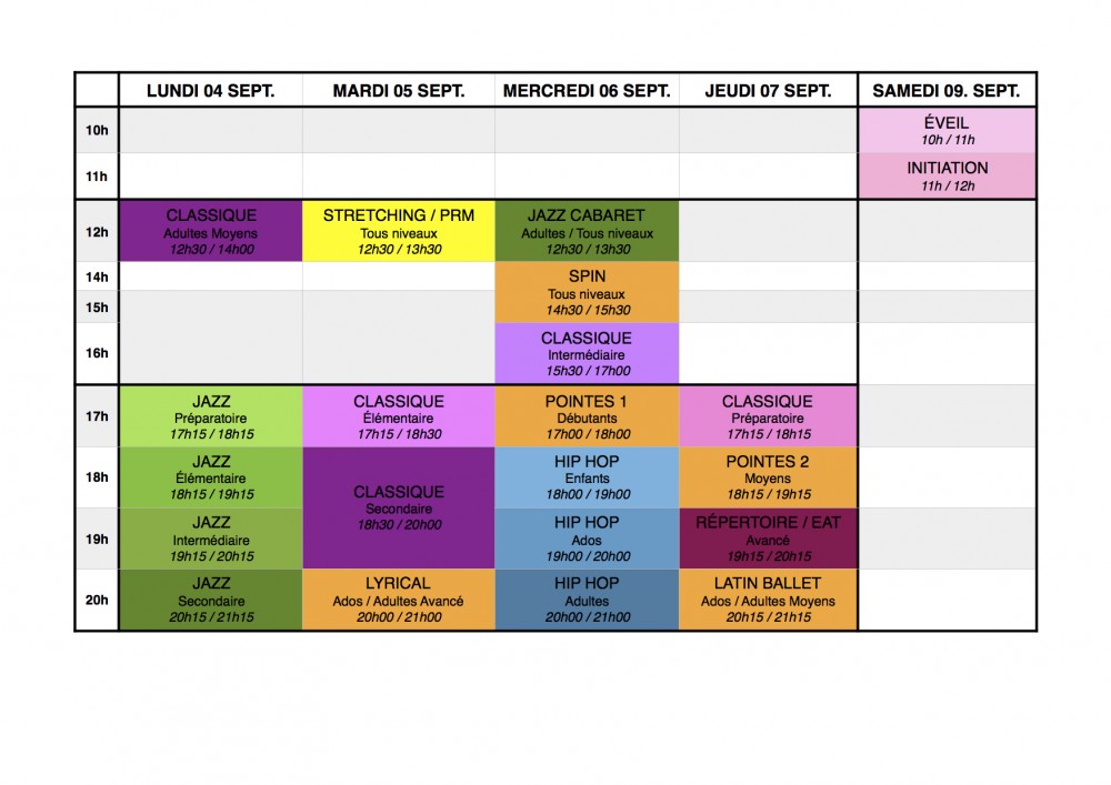 La semaine du 04 Septembre, un planning spécifique vous est proposé afin que vous puissiez essayer gratuitement tous les cours: