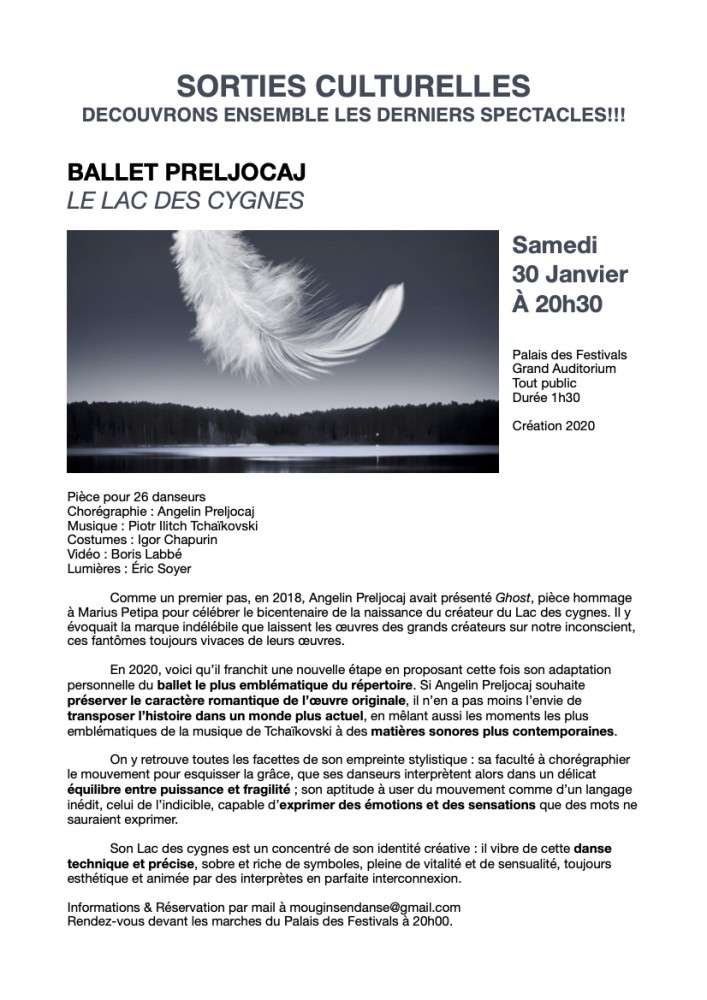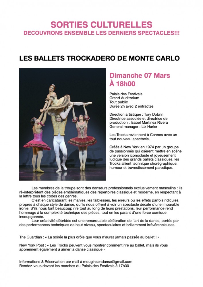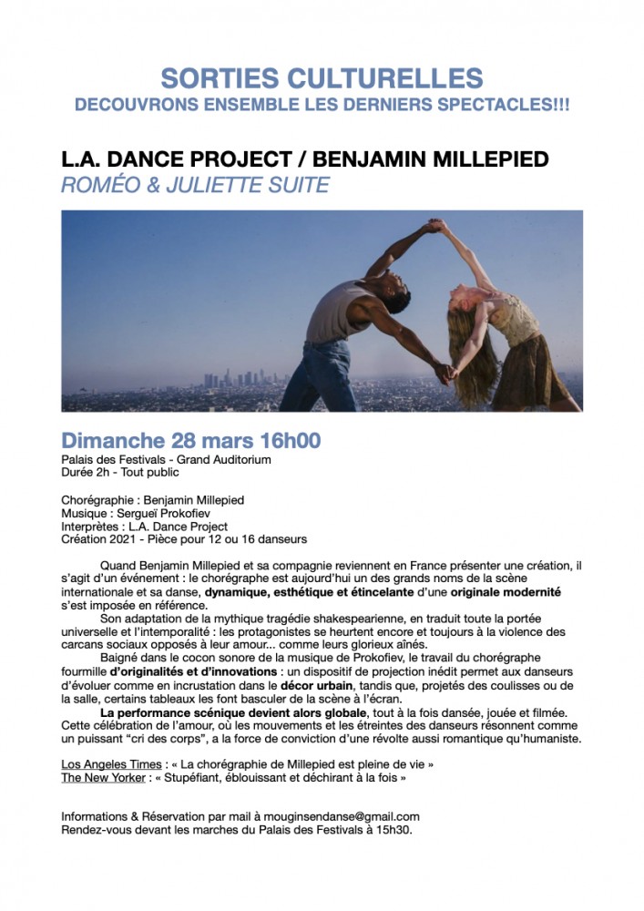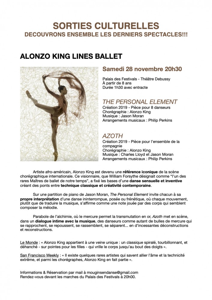 Depuis 2017, Mougins en Danse s'est unie au Palais des Festivals de Cannes afin de proposer aux élèves une sélection de spectacles sur la saison. Au delà d'une remise sur le prix public, c'est surtout l'occasion de partager ensemble une sortie culturelle et d'échanger avec vos professeurs sur le spectacle vivant! Notre objectif étant d'affiner la sensibilité artistique des élèves, d'éveiller leur curiosité, et de développer une culture chorégraphique propre au monde de la danse. Vous trouverez dans cet article les fiches descriptives des spectacles que nous vous avons sélectionnés.