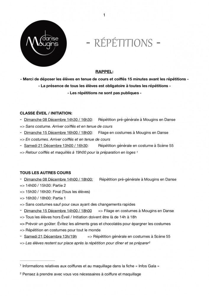 - Dimanche 08 Décembre 14h30 / 16h30: Répétition pré-générale à Mougins en Danse sans costume. Arriver coiffés et en tenue de cours