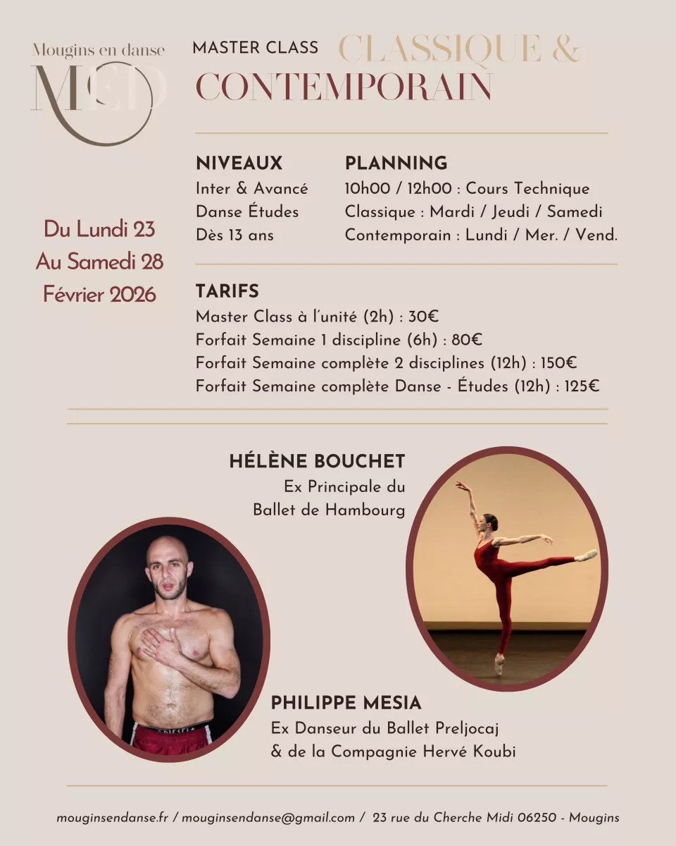 Ces températures hivernales nous donnent envie de nous emmitoufler... et de bouger ! C'est pourquoi nous proposons aux élèves dès 13 ans un stage sous forme de Master Class Classique & Contemporaine la deuxième semaine des vacances scolaires ! Toutes les informations ci-dessous :
