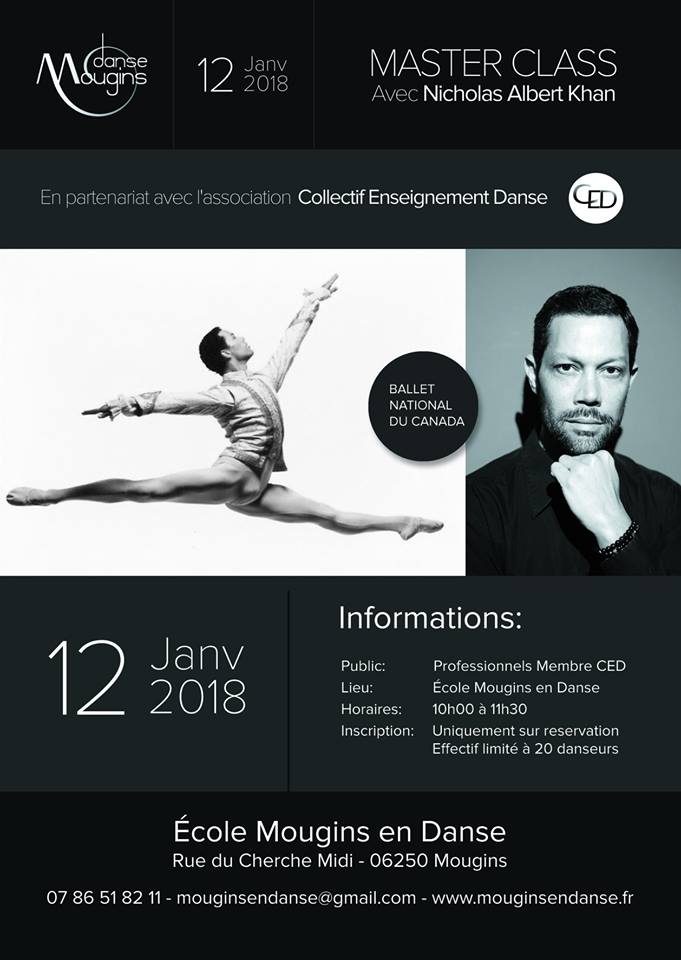 Ce Vendredi 12 Janvier, notre parrain Nicholas Albert Khan, ex danseur étoile du Ballet National du Canada, nous fait l'honneur d'être parmi nous! Au programme: Un Master Class pour les professionnels membres du CED - "Collectif Enseignement & Danse " le matin et un discours pour l'inauguration officielle en début de soirée. Nous aborderons ensemble les projets artistiques et pédagogiques de la saison et toute l'équipe sera présente pour répondre à vos questions.
