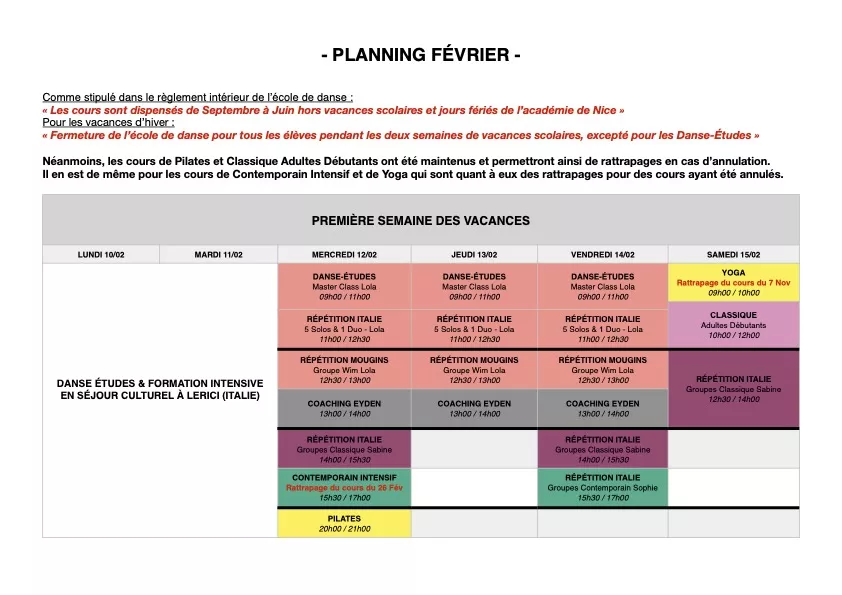 Les cours de danse et répétitions ont été réorganisés pour une meilleure logistique. Aussi, merci de prendre conaissance du planning spécifique que nous avons mis en place et que vous pouvez télécharger ci-dessous.