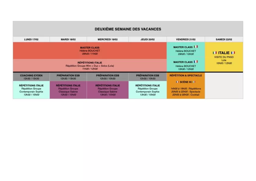 Pour cette deuxième semaine de vacances, nous vous proposons un stage du lundi au vendredi avec en professeure invitée le retour d'Hélène BOUCHET ! S'en suivront bien évidemment les répétitions pour notre spectacle de vendredi soir avec nos homologues italiens !