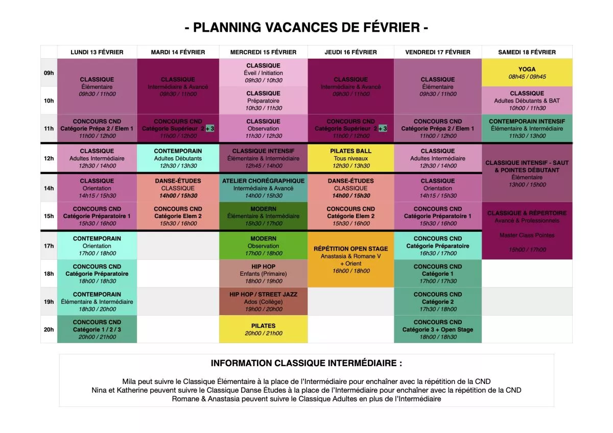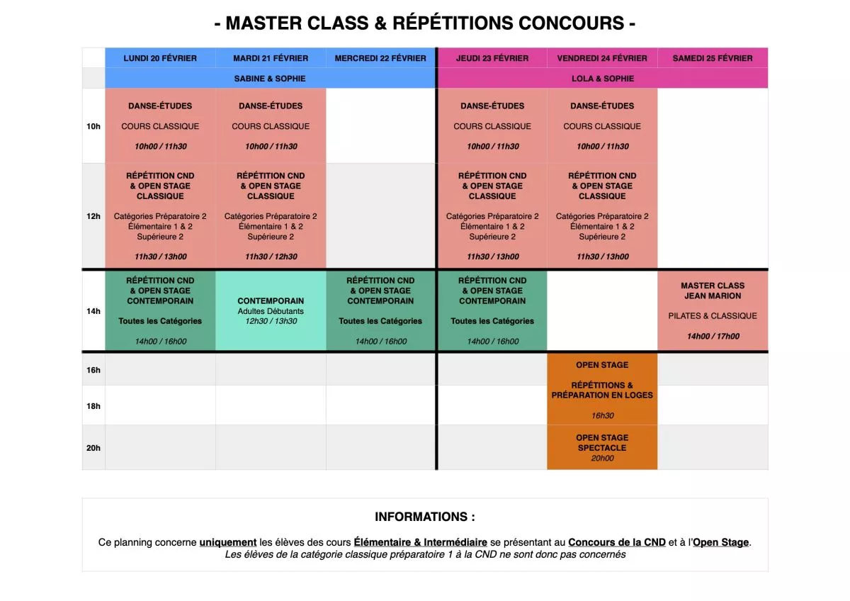 Comme d'accoutumée, les cours de danse NE seront PAS maintenus la 2ère semaine des vacances scolaires SAUF pour les élèves inscrits au Concours de la CND ainsi qu'à l'Open Stage de Jess Bourgeois. Pour les élèves concernés, merci de prendre note du planning établi ci-dessous :