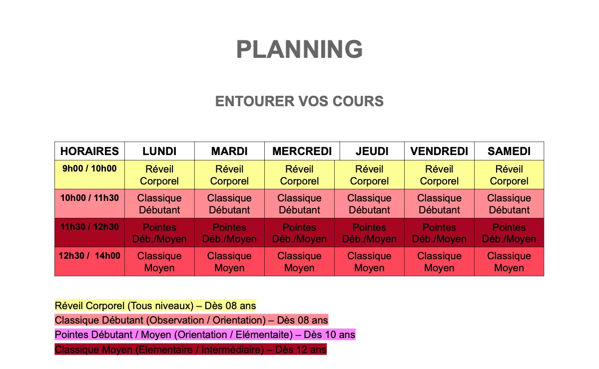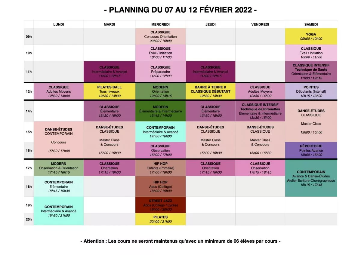 Comme d'accoutumée et afin de rattraper d'éventuelles annulations de cours liées au Covid, les cours de danse seront maintenus la 1° semaine des vacances scolaires selon un planning spécifique que vous pouvez télécharger ci-dessous :