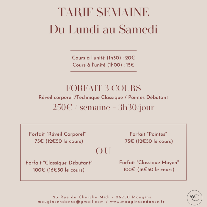 Envoyez un chèque à l'ordre de Mougins en Danse (Josiane BESSY - 1 Rond Point Minangoy - 06250 MOUGINS)